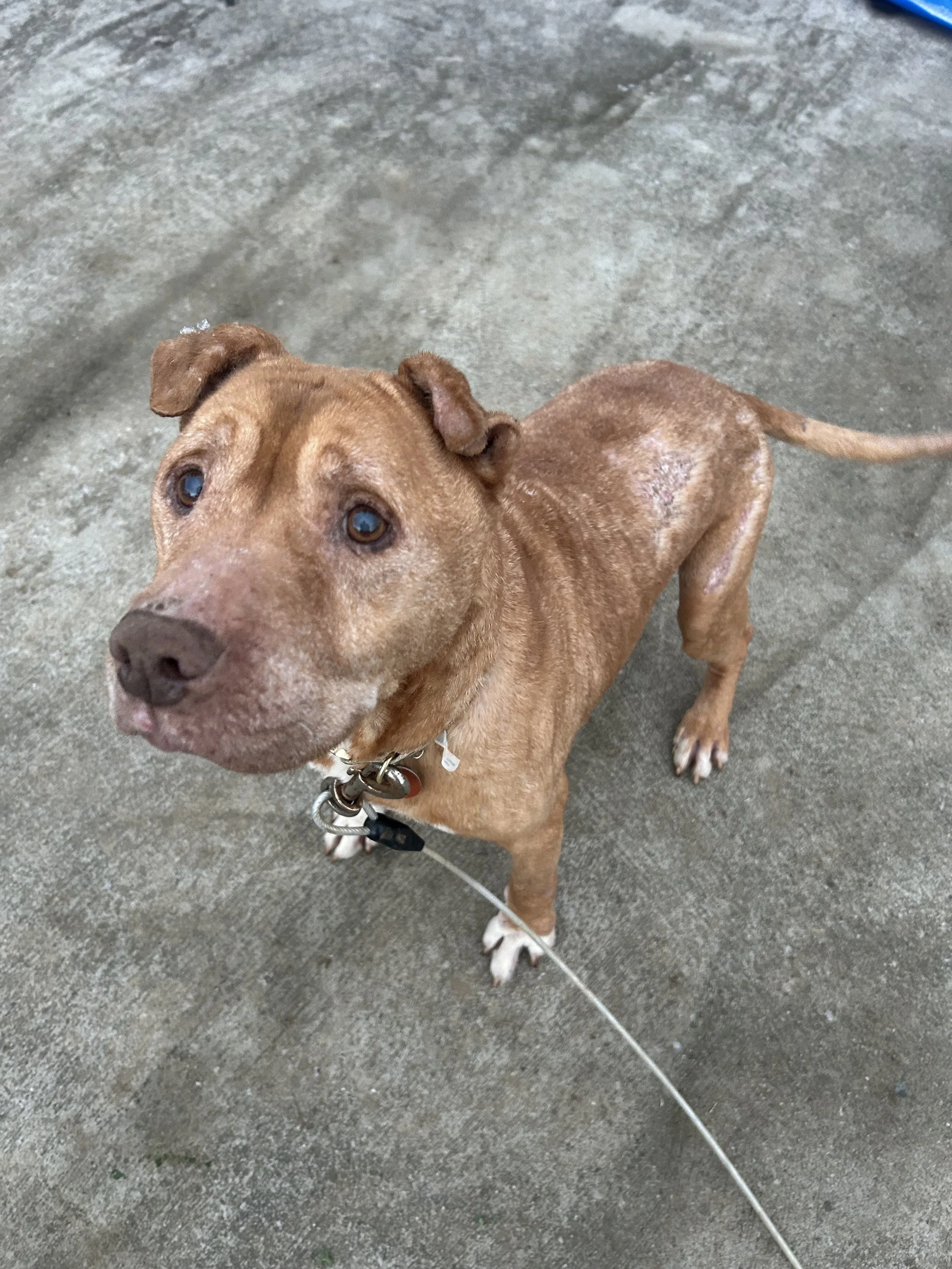 Tater is an 8–9-year-old Pit Bull mix with a remarkable spirit and a playful, loving personality, despite a past filled with unimaginable hardship. Originally rescued from Georgia by a Kentucky rescue, Tater endured severe abuse as a bait dog and suffered further trauma when acid was poured on him. He was later seized by local animal control due to hoarding and cruelty, eventually spending time in a very crowded shelter before finally being brought to safety.